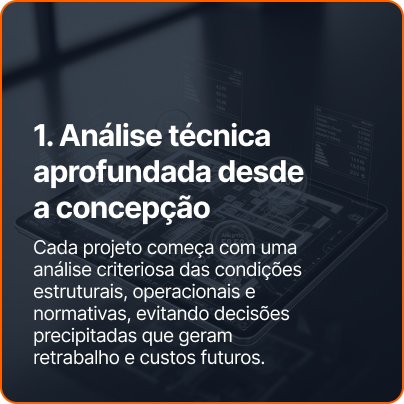 Atuamos exclusivamente no desenvolvimento de projetos técnicos, sem execução de obra ou fornecimento de serviços operacionais.